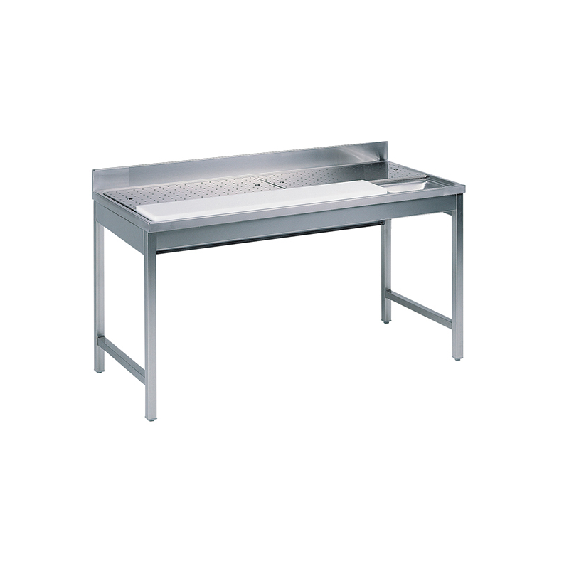 Kött och fisk 10/10 mm tjock bänkskiva preparetion tabell i rostfritt stål AISI 304 scotch brite finish, h. 40 mm, levereras med upstand H = 100, rätt avfallshantering hål, skära styrelsen gjord av nylon. Ram i rostfritt stål AISI 304 scotch brite finish, med justerbara fötter i rostfritt stål och nylon. Inga vassa kanter.