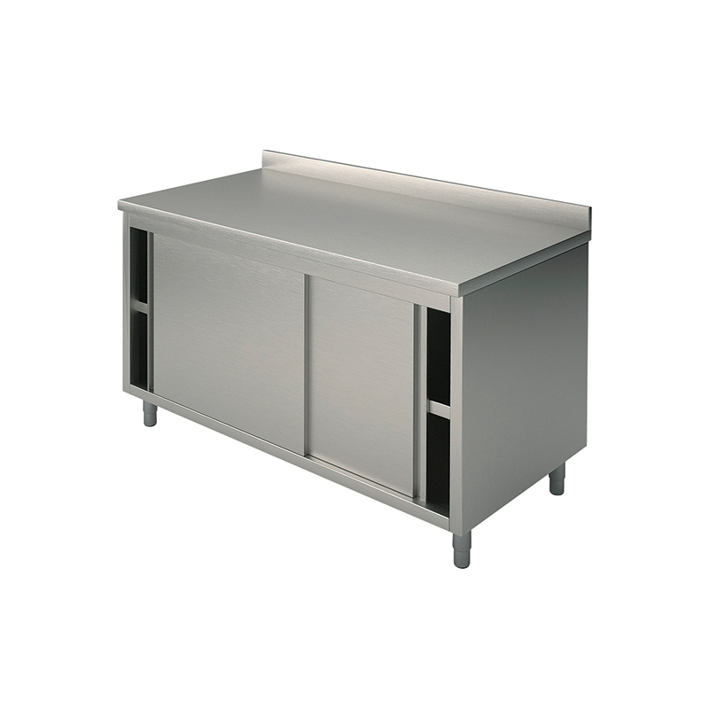 Bord skåp med upstand och skjutdörrar, 10/10 tjock bänkskiva tillverkad i rostfritt stål AISI 304 scotch brite finish, h 40 mm med inre förstärkning, botten täcks. Inbyggda upstand h. 100 mm. Ram med justerbar mellersta hyllan, isolerade skjutdörrar, sida, baksidan, hylla ligger på 150 mm från golvet, tillverkad i rostfritt stål AISI 304 scotch brite finish, levereras med justerbara fötter i rostfritt stål och nylon. Inga vassa kanter.