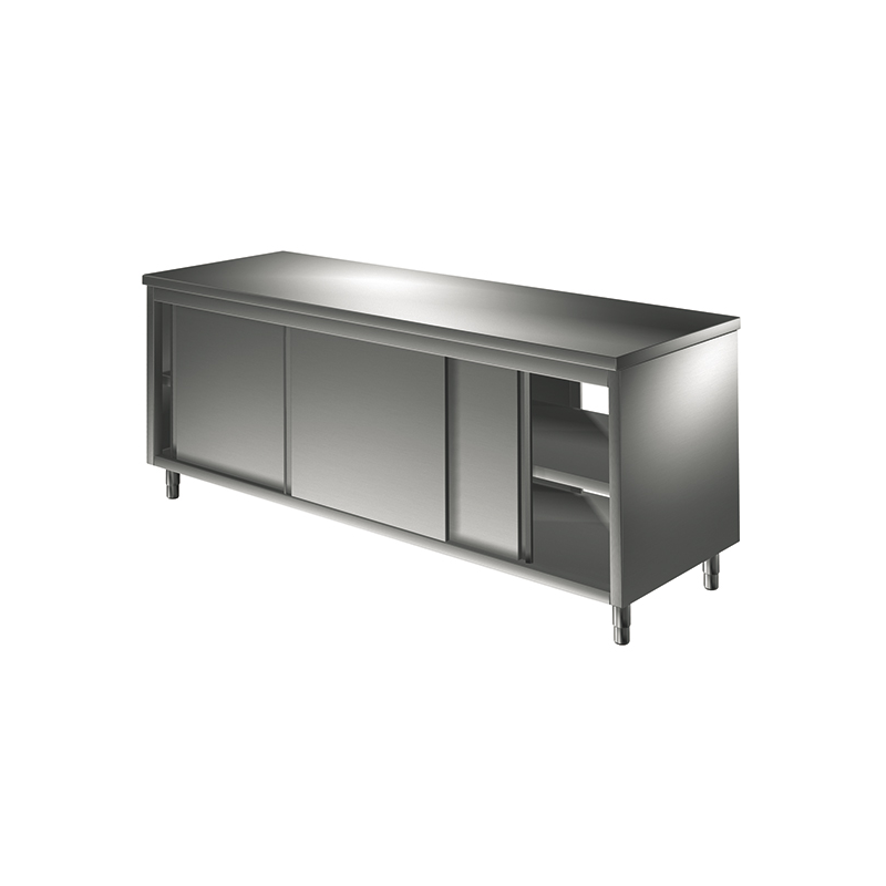 Bord skåp 304 Aisi rostfritt stål produkt via Central och rostfritt stål Aisi 304 topp och bas struktur mat Plan arbete utan stänk block och Scotch Brite avsluta allmänna förstärkt skjutdörrar på båda sidor med infällda handtag och slutet blockera rida en mellersta hyllan monterad på Höj-och sänkbart galler totalvikt stöds av mellanliggande golvet: 100-120 kg. Hylla med omega rostfri armering vid Center foten runt rör med möjlighet till justering av höjd +/-50 mm