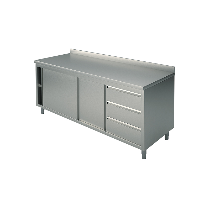 Bord skåp med lådor och skjutdörrar, 10/10 tjock bänkskiva tillverkad i rostfritt stål AISI 304 scotch brite finish, h 40 mm med inre förstärkning, botten täcks. Ram med justerbar mellersta hyllan, isolerade skjutdörrar, sidor, baksida, hylla är ligger på 150 mm från golvet, tillverkad i rostfritt stål AISI 304 scotch brite finish, levereras med justerbara fötter i rostfritt stål och nylon. GN 3-låda enhet, alla gjorda i rostfritt stål AISI 304 scotch brite yta. Inga vassa kanter.