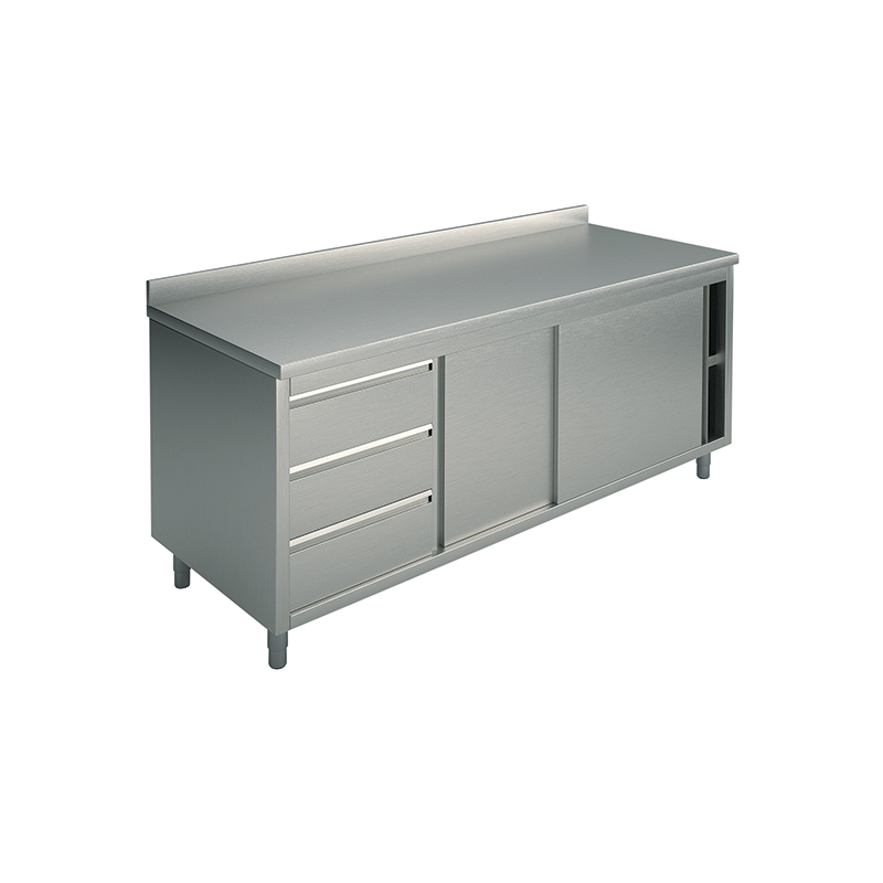 Bord skåp med lådor och skjutdörrar, 10/10 tjock bänkskiva tillverkad i rostfritt stål AISI 304 scotch brite finish, h 40 mm med inre förstärkning, botten täcks. Ram med justerbar mellersta hyllan, isolerade skjutdörrar, sidor, baksida, hylla är ligger på 150 mm från golvet, tillverkad i rostfritt stål AISI 304 scotch brite finish, levereras med justerbara fötter i rostfritt stål och nylon. GN 3-låda enhet, alla gjorda i rostfritt stål AISI 304 scotch brite yta. Inga vassa kanter.