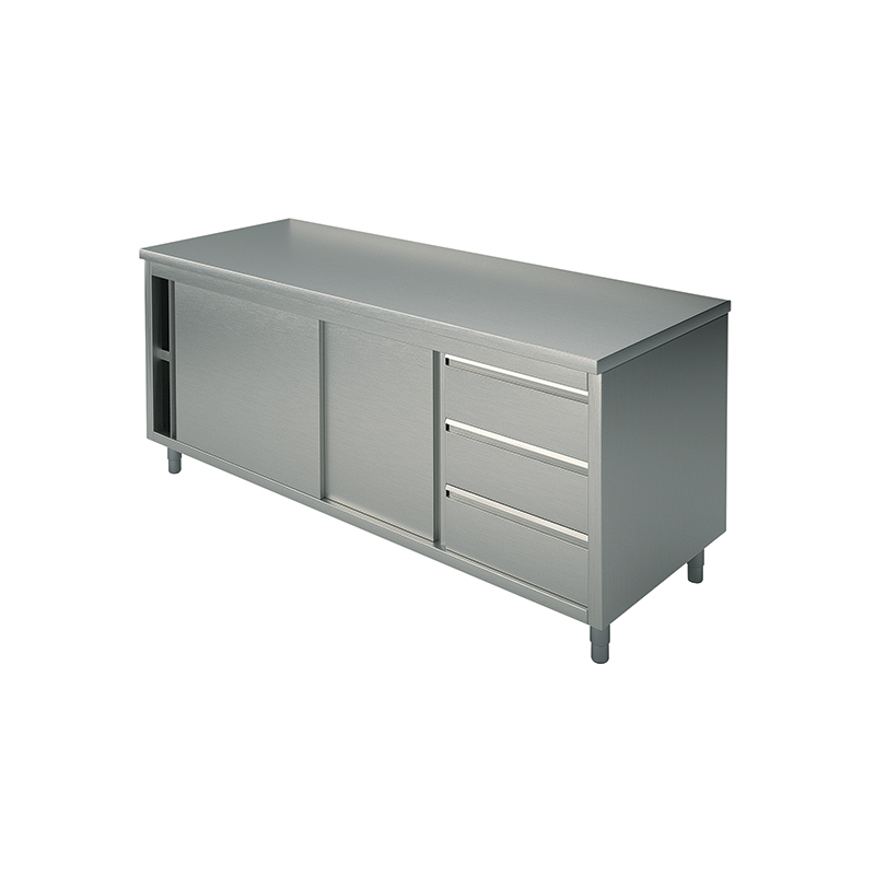 Bord skåp med lådor och skjutdörrar, 10/10 tjock bänkskiva tillverkad i rostfritt stål AISI 304 scotch brite finish, h 40 mm med inre förstärkning, botten täcks. Ram med justerbar mellersta hyllan, isolerade skjutdörrar, sidor, baksida, hylla är ligger på 150 mm från golvet, tillverkad i rostfritt stål AISI 304 scotch brite finish, levereras med justerbara fötter i rostfritt stål och nylon. GN 3-låda enhet, alla gjorda i rostfritt stål AISI 304 scotch brite yta. Inga vassa kanter.