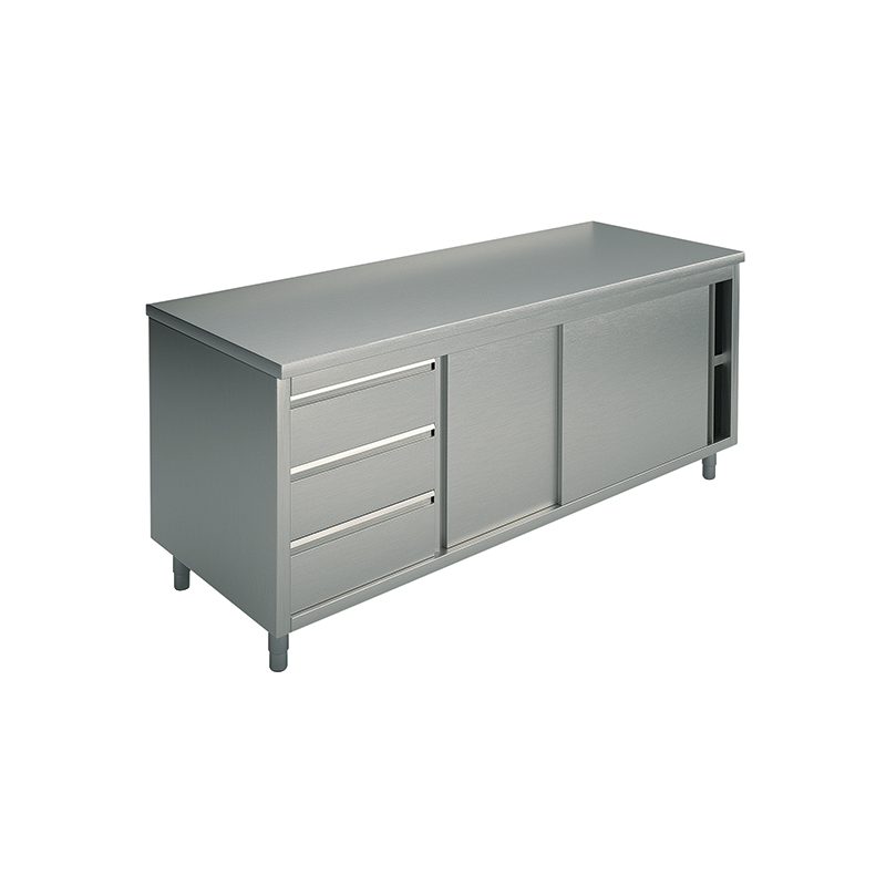 Bord skåp med lådor och skjutdörrar, 10/10 tjock bänkskiva tillverkad i rostfritt stål AISI 304 scotch brite finish, h 40 mm med inre förstärkning, botten täcks. Ram med justerbar mellersta hyllan, isolerade skjutdörrar, sidor, baksida, hylla är ligger på 150 mm från golvet, tillverkad i rostfritt stål AISI 304 scotch brite finish, levereras med justerbara fötter i rostfritt stål och nylon. GN 3-låda enhet, alla gjorda i rostfritt stål AISI 304 scotch brite yta. Inga vassa kanter.