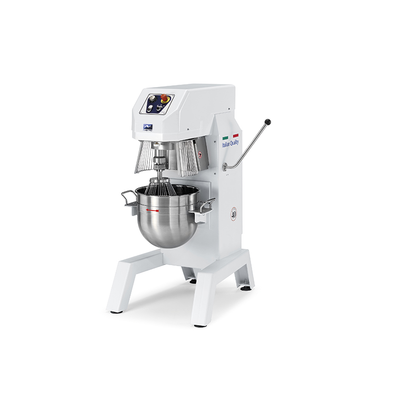 Planetariska mixern är helt gjord i metall färg. Verktyg och rutnät är i rostfritt stål AISI 304, lämplig för kontakt med livsmedel. Solid och lite bullriga är lämplig för små och medelstora laboratorier för framställning av degar och krämer av olika typer, Söt eller kyndel. Maskinen är lämplig emulsion, slå, knådning och mixning. Kapaciteten av tanken är 40 liter. Modellen är med 3-hastigheter. Upphävandet av skålen är manuell. Lätt att använda och ren, finns det också med ställfötter, i fall där golvet är ojämnt. Den planetariska uppfyller aktuella EG-förordningar. Maskinen är utrustad med: stekspade, visp och spiral.