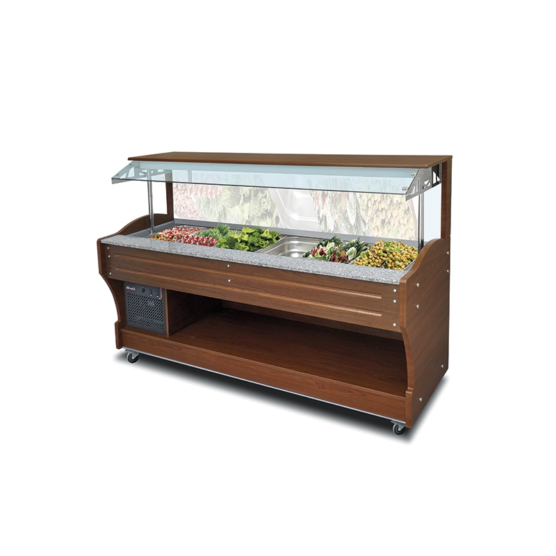Sido- och främre dekorativa trä paneler är gjorda. Kylsystemet styrs av termostaten. Köldmedium R134A. Basin tillverkad av rostfritt stål AISI 304 med runda hörn att garantera maximal hygien. Töm tryck. Statisk kylning. Polyuretanisolering, CFC gratis. Kylsystemet styrs av termostaten. Arbeta counter 20 mm granit. Hylla för tallrikar. Vägg sida med spegel. Hjul och LED-belysning.