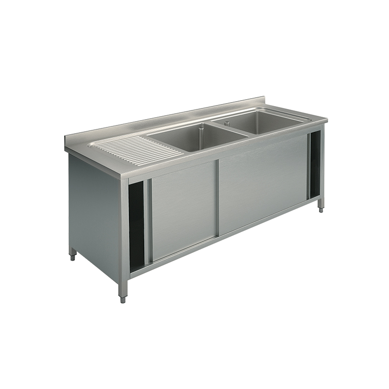 Sänka enheten på skåp med dörrar och rätt diskställ. 10/10 tjock bänkskiva i rostfritt stål AISI 304 scotch brite finish, h 40 mm avlopp, overflow röret. Inbyggda h:100 mm. upstand Ram med sidor, isolerade skjutdörrar, hylla är ligger på 150 mm från golvet, tillverkad i rostfritt stål AISI 304 scotch brite finish, levereras med justerbara fötter i rostfritt stål och nylon. Inga vassa kanter.