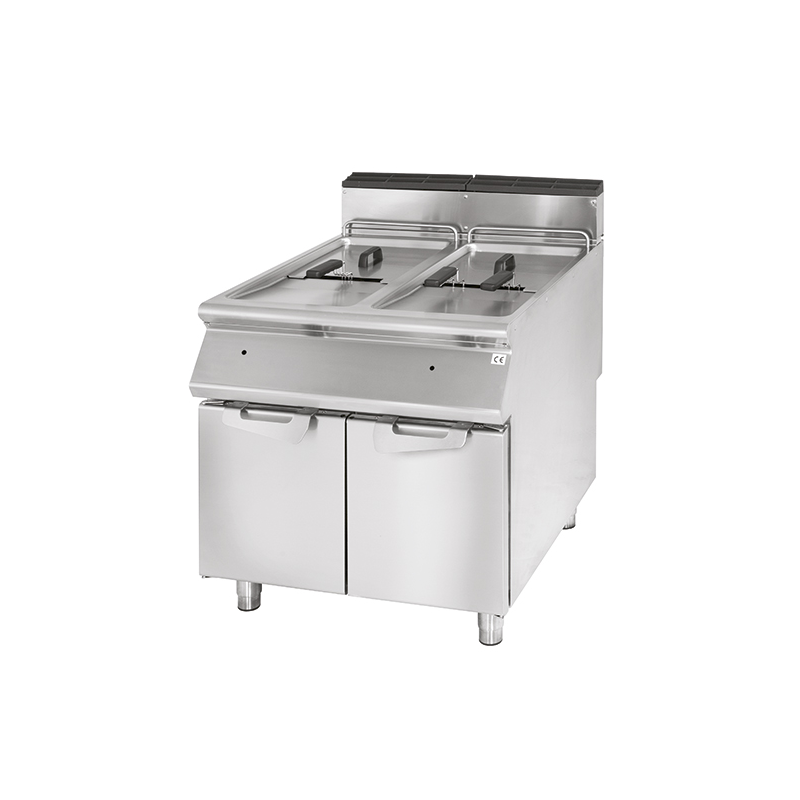 Gas fritös med 1 wells 13 + 13 liter, modell på räknaren med dörrar. Sidopaneler, botten och baksida i rostfritt stål. Topp tillverkad i AISI 304 tjocklek 15/10 avsedd för infälld justering. Bakre rökkanalen i emaljerat gjutjärn. Djupt nedtryckt brunnar med främre expansion zon för olja insamling och kalla zonen för mat partiklar samling. Uppvärmning med hjälp av högeffektiva rostfria brännare inuti brunnen. Tändning med hjälp av piezoelektriska anordningar. Säkerhet termostat med manuell återställning. Utrustad med 2 + 2 korgar med termoplast handtag. Justerbara fötter i rostfritt stål. IPX4 skydd värdering. 20,4 kW total power gas.