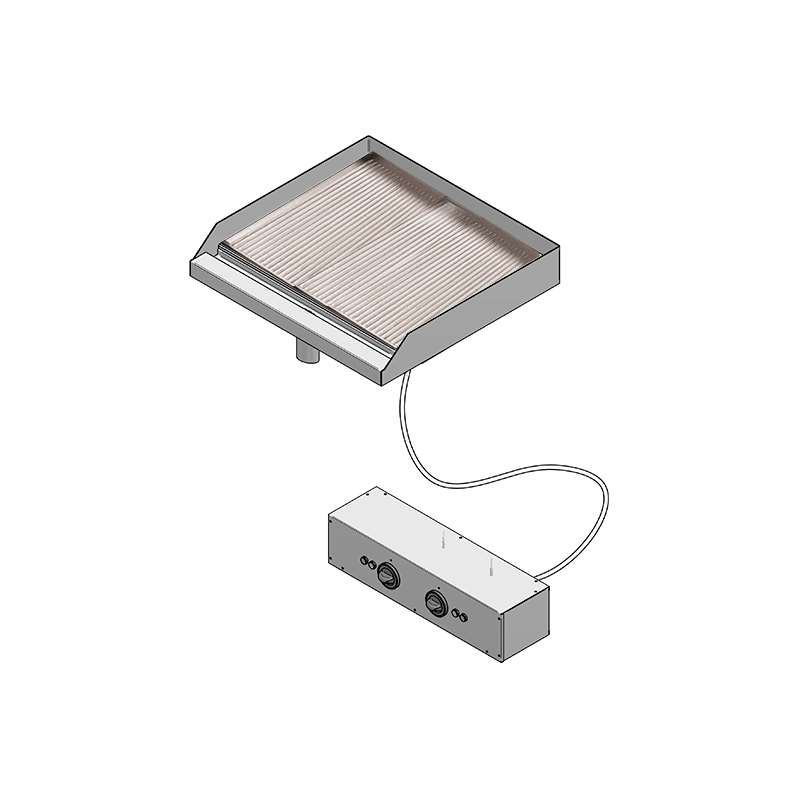 Pressade rostfritt stål AISI 304 arbetande topp. Ytan och matlagning plattan hermetiskt svetsat samman för att undvika luckor. Kokplattor i satin. 10 mm sluttande yta för att enkelt samla fett. Medföljer: främre flyttbara fett samlande låda och spray guard hertig.