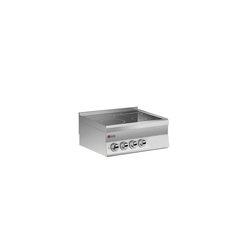Spisar med glaskeramiska 4 kokplattor som är märkta med ett runt silkeskärm. Energibesparingsanordningen gör att du kan ställa in temperaturen och ett ljus indikerar om det finns resterande värme på toppen. Apparaten är försedd med en apparat som upptäcker panelen och ett driftsljus. Kokplattan är gjuten av en enda bit AISI 304 18/10 rostfritt stål med Scotch Brite finish.