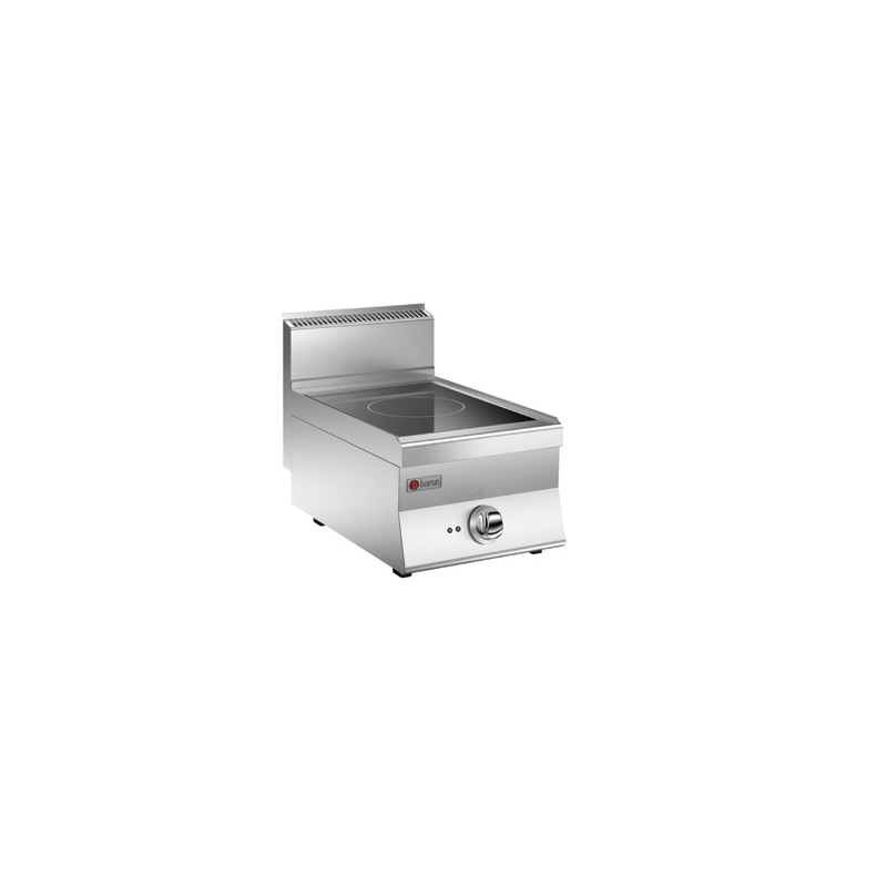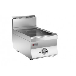 Induktionskokare med 1 kokplats (diam 220 mm) för 5 kW kraft per område. Energibesparingsanordningen gör att du kan ställa in temperaturen och ett ljus indikerar om det finns resterande värme på toppen. Apparaten är försedd med en apparat som upptäcker panelen och ett driftsljus. Kokplattan är gjuten av en enda bit AISI 304 18/10 rostfritt stål med Scotch Brite finish.