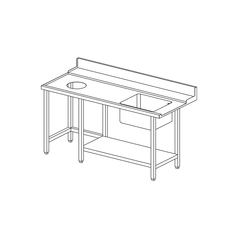 Topplattan i rostfritt AISI 304 18/10. Inmatningstabellen. Basket löpare djup Max 510 mm. Krok för hood-typ diskmaskin. RAM: Tubulär form 40 x 40 mm i borstat rostfritt stål AISI 304 18/10. Lägre hylla i rostfritt stål. Längsgående förstärkning i mitten av hyllan. Fötter: med nivellering torget stud, justerbar.