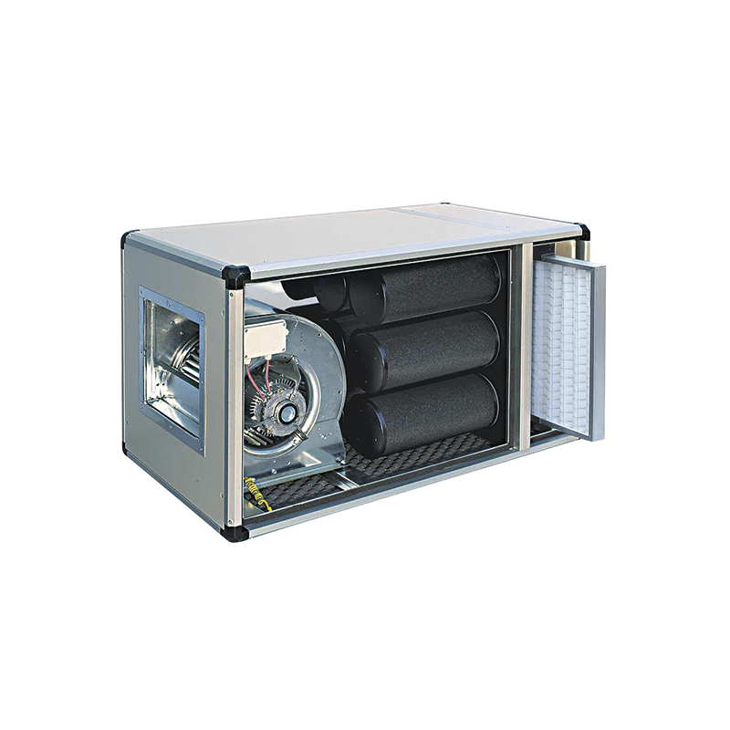 Strukturella formen aluminiumram. Dubbelrum flyttbara zink-plast paneler med interna ljud â € ”bevis i polyuretan och flyttbara till kopplingsbox â €” sida. Dubbla inlopp Radialfläkt 230/1/150 IP55. Syntetiska filter 48 mm th., 85% eff gravimetrisk. â € ”G3 EN 779. Metalliska rutnät filtrerar 48 mm th. Och 207 aktivt kol filter.
