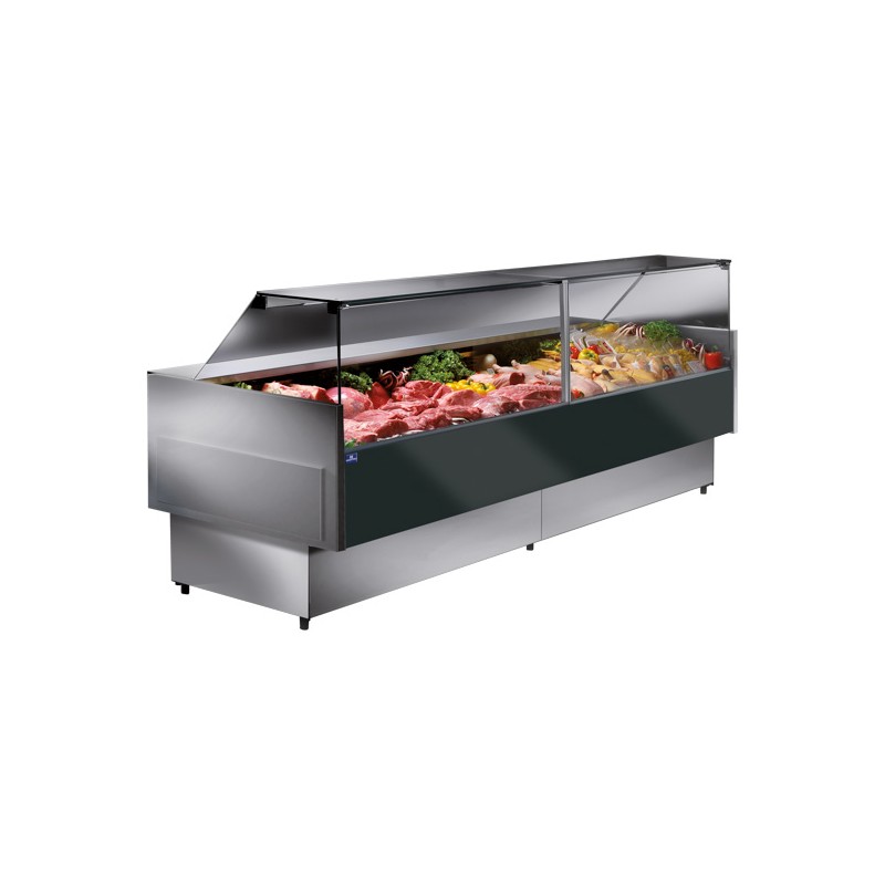 Utrustad med elektronisk kontrollpanel, neonbelysning och fällbart frontglas för enkel rengöring och service. Exponeringsyta i rostfritt stål med integrerat vätskeuppsamlingssystem, rostfri arbetsyta samt avdunstningsbricka för kondensvatten. Tidsstyrd avfrostning ingår.
