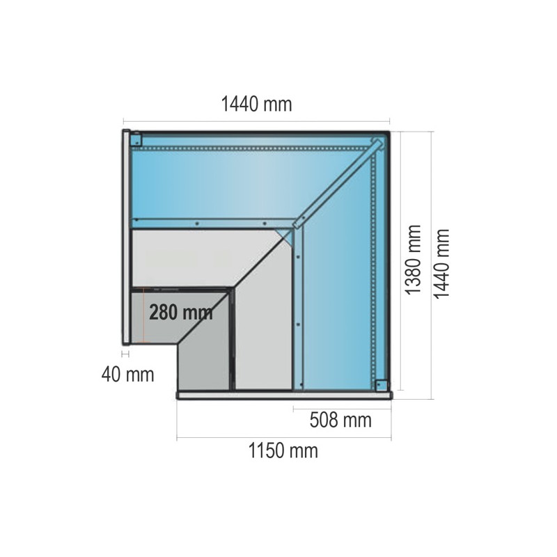 Kyld köttdisk i hörnutförande (öppen modell) med vertikal glasfront – den perfekta lösningen för trånga butikslayouter och hörnplaceringar.