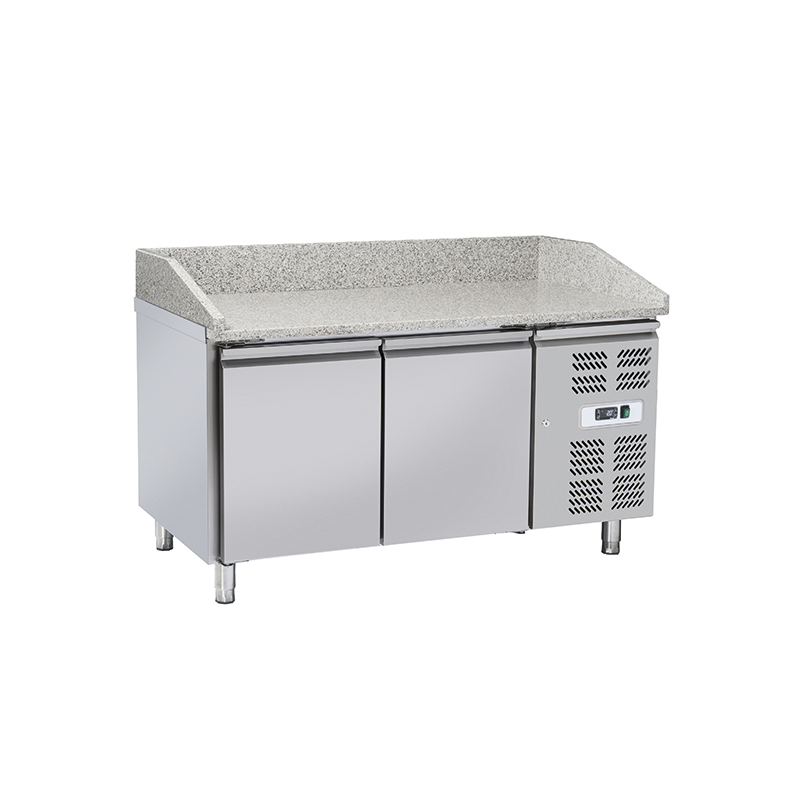 Kylskåp counter pizza intern kapacitet för fack och behållare med 2 dörrar och granit bänkskiva. Rostfritt stål inre och yttre, utom undersidan av galvaniserat stål. Insidan hörn är rundade. Isoleringen är tillverkad av CFC-fri polyuretan, injiceras med högt tryck. Dörrarna är automatisk stängning med magnetisk förslutning. På framsidan är en elektronisk kontrollpanel med NTC. Kyl är ventilerade. Avtagbart och monoblock kylar enhet tropiska förhållanden (omgivningstemperatur + 43° C och relativ luftfuktighet på 65%) arbetar med gas R600A helautomatisk avfrostning och kondensat avdunstning. Rostfritt stål fötter justerbar i höjd, medan bänkskivan är granit och topp isolering. Tabellen Pizza är lämplig för kylda montrar med oberoende grupp.