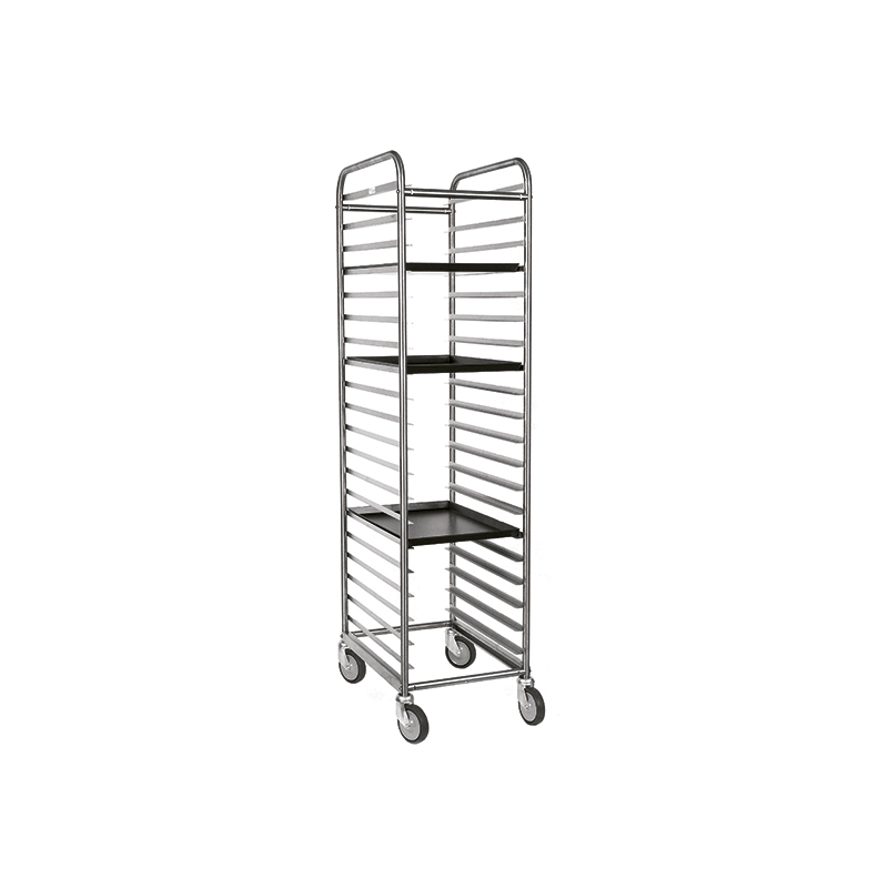 Byggd helt i rostfritt stål med en 25 mm runda tubulär stödstruktur. 12 cm mellan hyllorna. 100 mm hjul med hög densitet polymer support. Facket stöder säkrade till tubulär stål med rostfritt stål strukturella nitar.