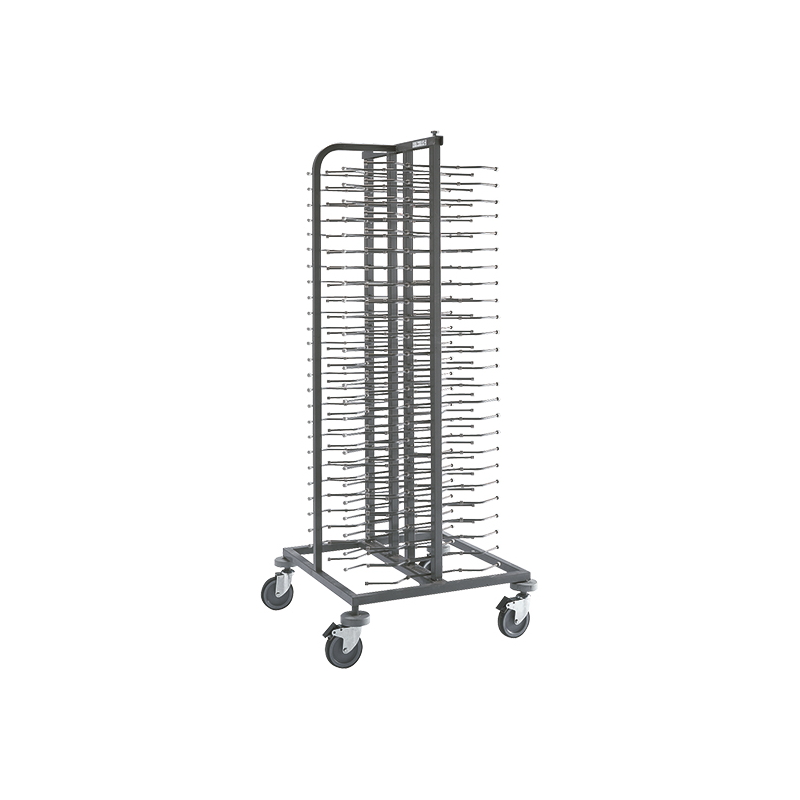 Robust struktur, helsvetsade. Tillverkade av högkvalitativt rostfritt stål, med epoxi finish för att förhindra rost och korrosion. Fyra (4) hjul med 125 mm diameter, två (2) av dem med bromsar för säkrare användning. Icke-märkning, särskilda gummi stötfångare skyddar mot direkt påverkan i alla fyra (4) hjul. Enkel justering av plattan stöder, enligt diametrar av plåtar upp till 33 cm diameter. Maximal kapacitet: 100 plattor. Separation mellan nivåer: 60 mm. Lätt att flytta med mitt spö, som dessutom ger maximal styvhet struktur.