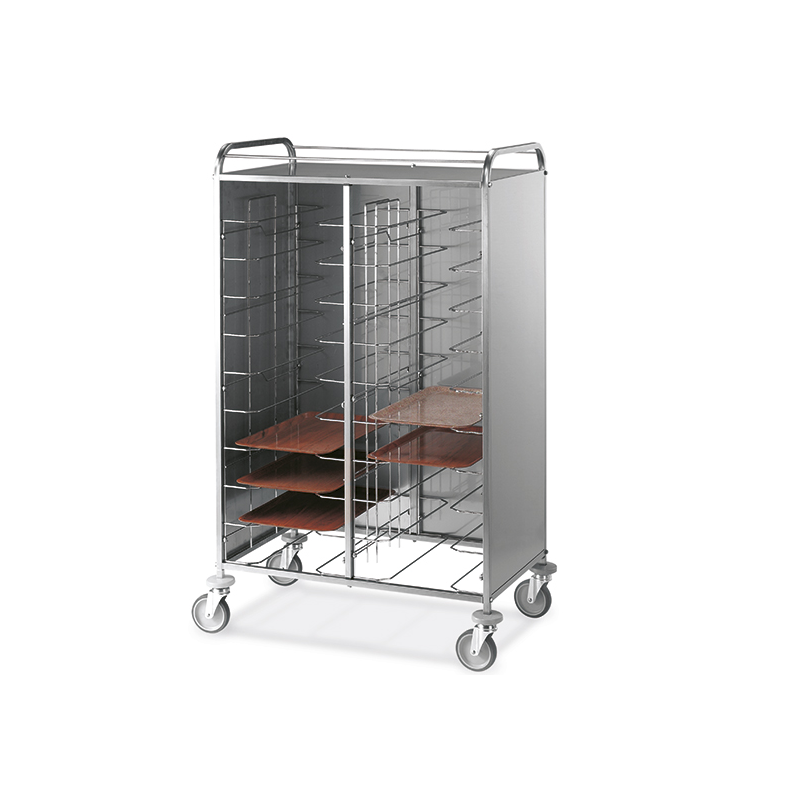 â * 2x2cm fyrkantsrör konstruktion i rostfritt stål med bultade cross-medlemmar â * förkromad ståltråd stöder â * passar brickor av max 53x39cm, även i olika storlekar och former â * grått gummi ring buffertar â * Swivel hjul 12,5 cm, 2 med bromsar ö¸ â * AISI 304 rostfritt stål paneler på tre sidor, översta hyllan med skenor