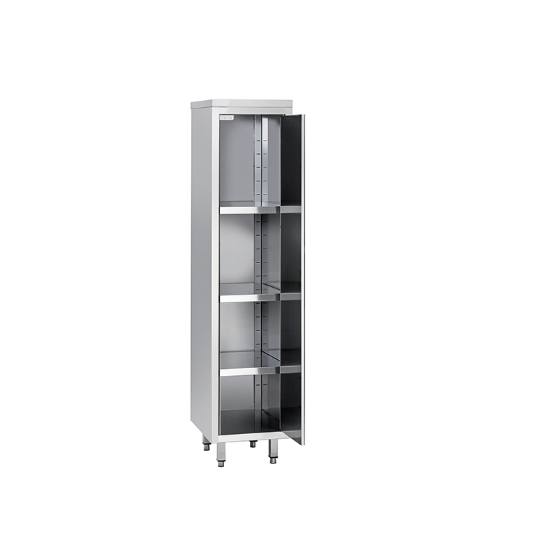 Skåp med gångjärnsdörrar med AISI 304 rostfritt stål topp 10/10 tjocklek i scotch brite finish, h 40 mm med inre förstärkning. Ram med baksidan, n ° 3 justerbar hylla, sidor, isolerade dörrar, hylla ligger på 150 mm från golvet, rostfritt stål AISI 304 s görs i scotch brite finish, supp ljög med justerbara fötter i rostfritt stål och nylon. Inga vassa kanter.