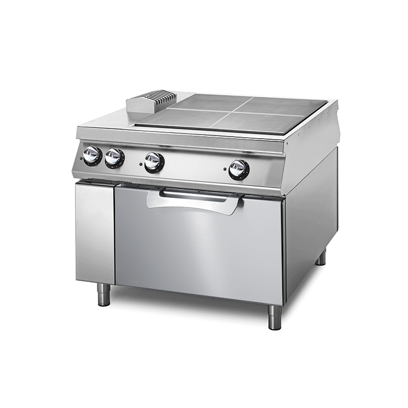 Arbetsyta i rostfritt stål AISI 304, tjocklek 20/10. Elektrisk spis i 4 oberoende zoner från 3,4 kW vardera krom 16MO5 stål. Toppa med spill samling av fetter. Aktivera den värme termostaten med inställbar Ytvattnets temperatur 50° C till användning temperatur: ° C. Pilot ljus för korrekt drift av utrustningen. Modell på statisk elektrisk ugn, kapacitet GN 2/1, ställningar och rostfritt stål kammare med labyrinttätning. Uppvärmning ugnen med hjälp av övre och nedre element som kan justeras oberoende av varandra. Temperaturreglering från 50° C till 300° c. Effekt 9 kW.