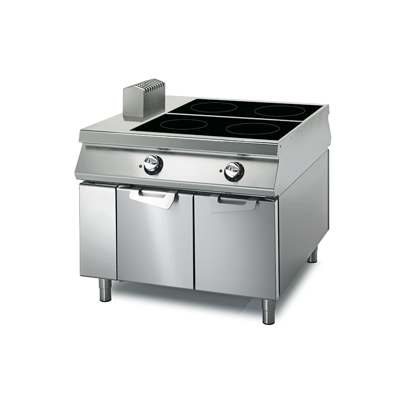 Elektrisk spis rostfritt AISI 304 rostfritt stål, tjocklek 20/10. Glaskeramik spis hermetiskt i golvet, från 2 eller 4 oberoende matlagning zoner, alla med 3,4 kW power och cirkulära element kontrolleras av energitillsynsmyndighet. De uppvärmda zonerna avgränsas av konturer tryckt på glaset. Utrustade med en varningslampa för att kontrollera rätt driften av utrustningen.
