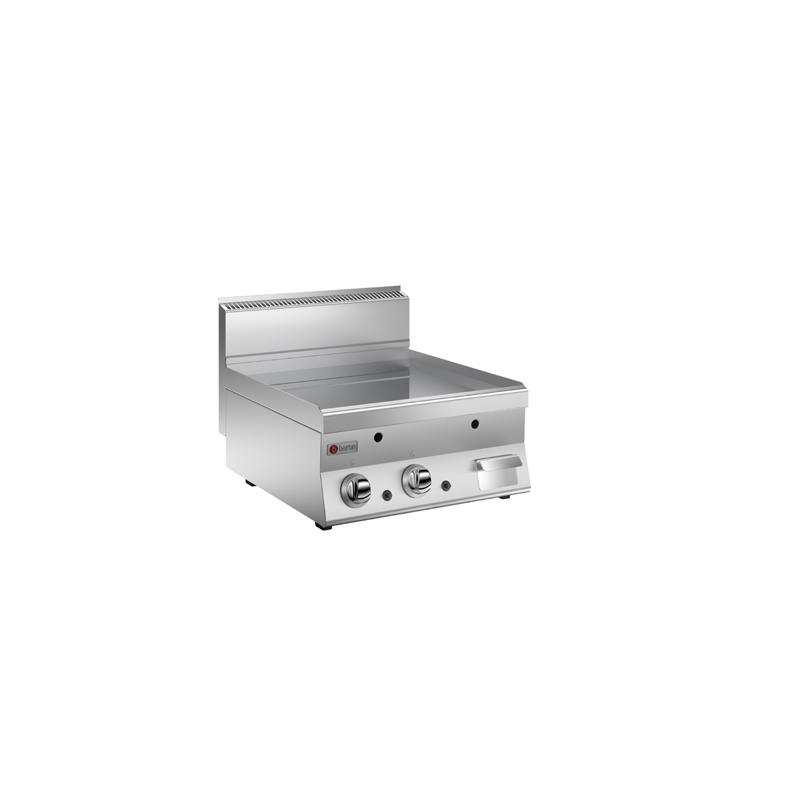 Stålplattorna värms upp av gasbrännare för att garantera att temperaturen stiger snabbt och bibehåller de förinställda värdena. Temperaturen kan justeras från 120-280 ° C. Plattorna är utrustade med stänkskydd så att hällen kan hållas helt ren och hygienisk. Arbetsytan är något lutande för att skicka såser, fett och förband i det kondensiva droppbrickan som är utformat för detta ändamål. Designad med piezoelektrisk tändning, pilotflamma, termoelement och ventiler för att säkerställa maximal säkerhet.
