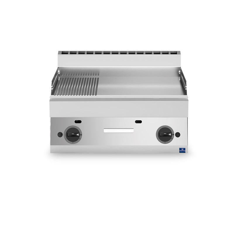 Gasstekhäll med Top räfflad plåt i AISI 304 rostfritt stål tjocklek 8/10; beläggningen av AISI 430 rostfritt stål 8/10; bottnar och interna delar i AISI 430 stål; inre förstärkningar av rostskydd material. (aluminiumiserade plåt). Utrustad med två oberoende matlagning zoner. Försedd med främre groove, extraherbara låda för fett insamling och stänkskydd på tre sidor. Utrustade med stål burner och pilot brännare med piezoelektrisk tändning-Gas som levereras genom säkerhetsventil med termoelement och pilot brännare för automatisk brännare tändning. Brännare 2 x 5,7 kW. Total effekt 11,4 kW plattan dimensioner 695 x 520 mm.